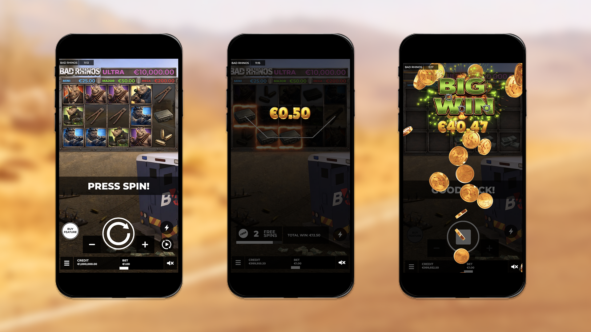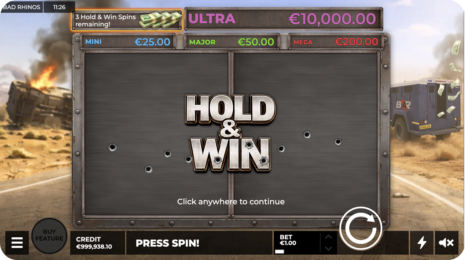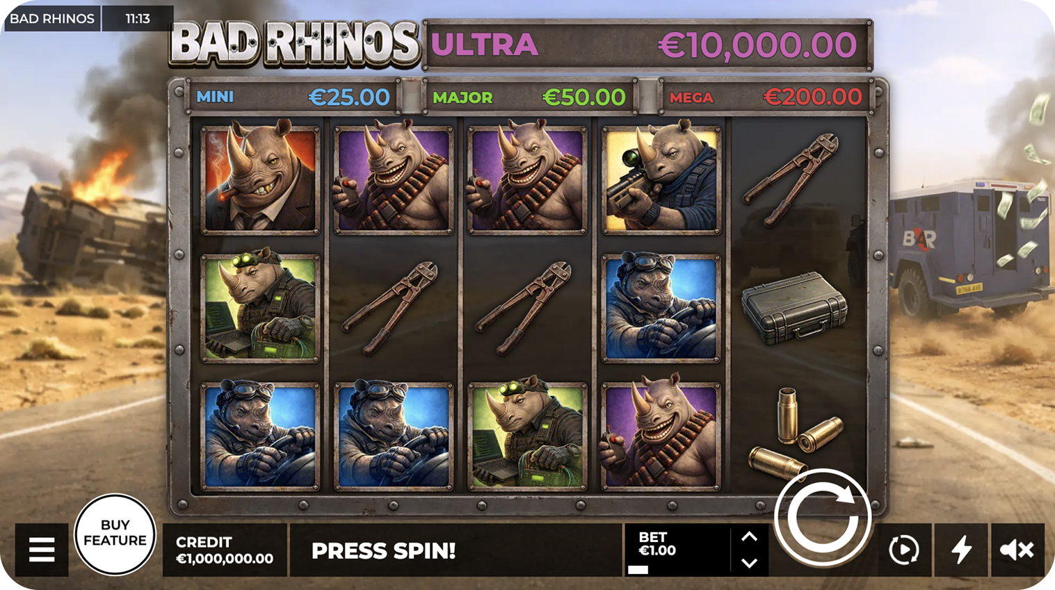 Gear up for a high-stakes heist with Bad Rhinos! Join this elite crew of heavy-hitting mercenaries in a gritty, action-packed slot adventure where the stakes are high and the rewards are massive. With an industrial 5x3 grid and an explosive atmosphere, these rhinos aren’t just breaking the law—they’re breaking the bank!
